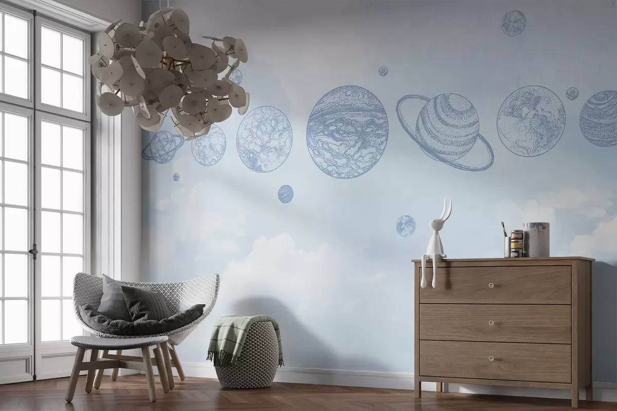Floating planets in a cloudy, pastel ethereal sky - Wall mural (No. w00738)