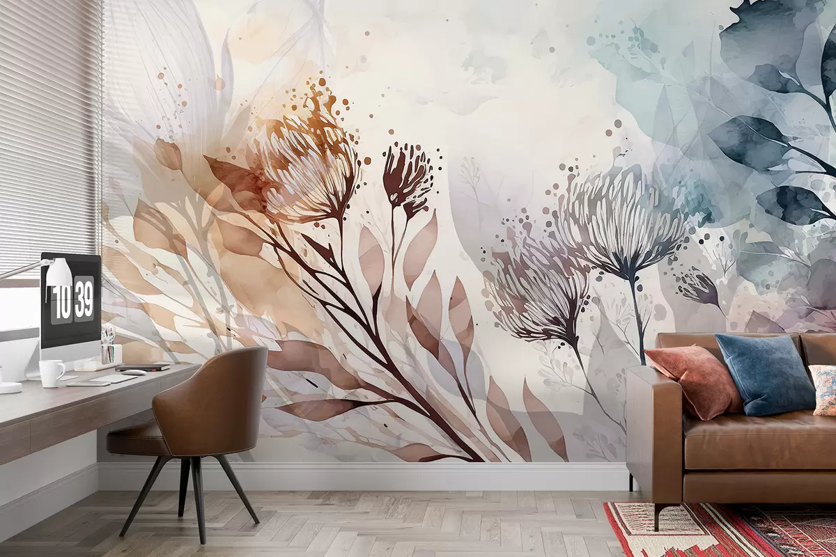 Delicate floral abstract, stylized flowers and plant forms elements in muted, earthy tones watercolor art - Wall mural (No. w00898)