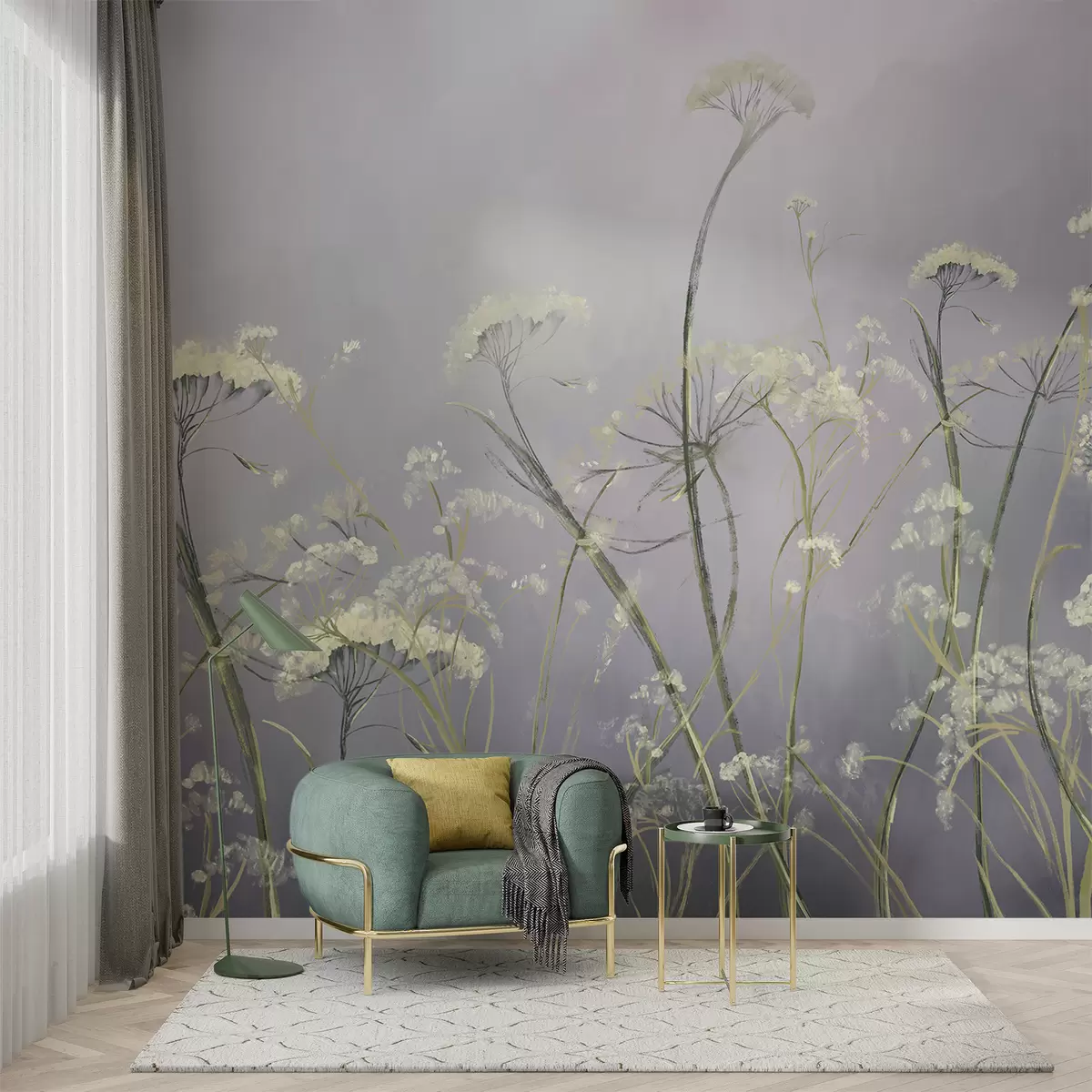 White wildflowers in a misty field with soft, blurred gray background - Wall mural (No. w00903)