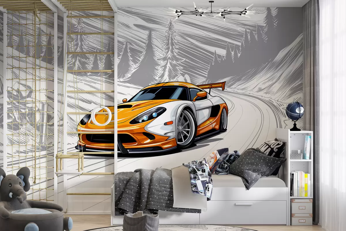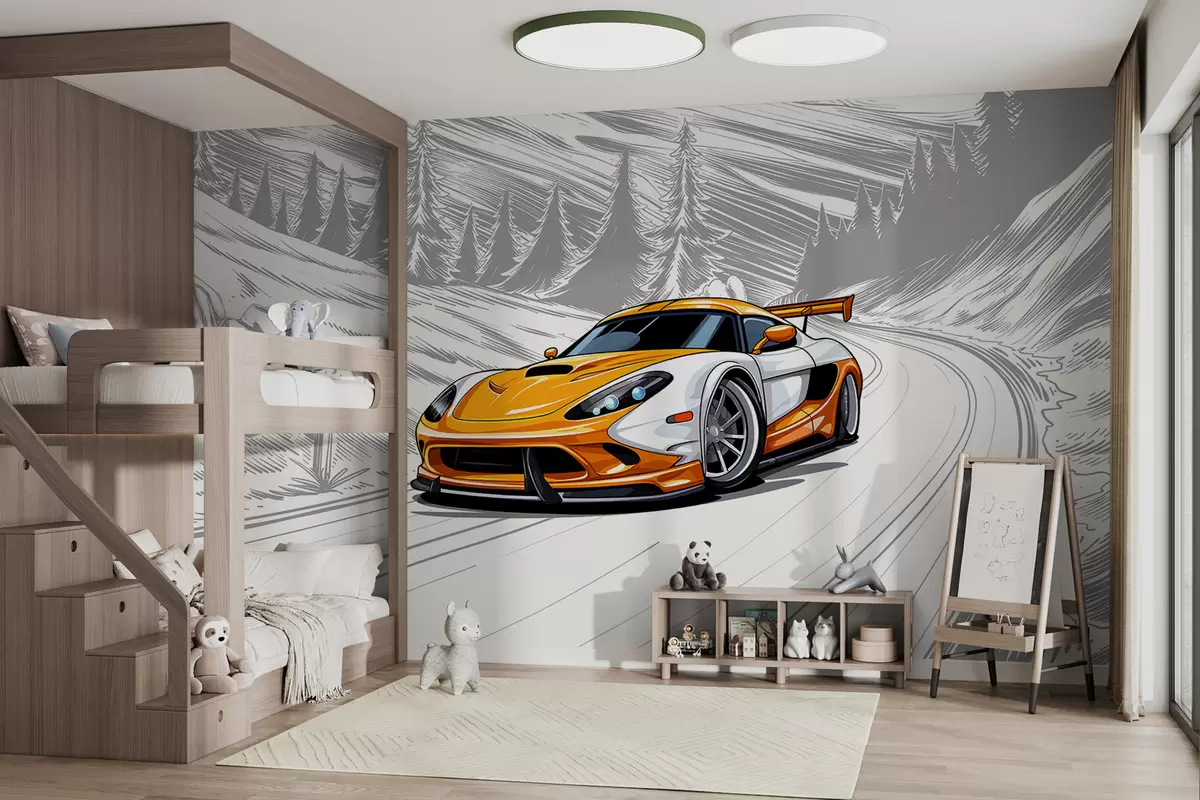 An orange sports car on a gray sketchy road background among mountains and fir trees. To decorate a boy's room - Wall mural (No. w00954)