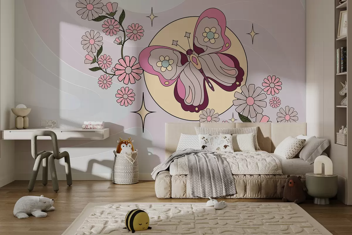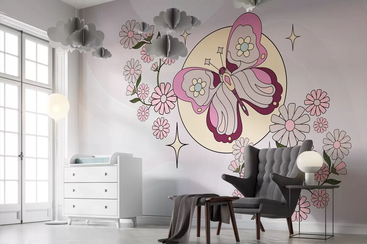 wallpaper with a pink butterfly on a light gray-pink background among flowers in a simple style for a girl's room - Wall mural (No. w00985)