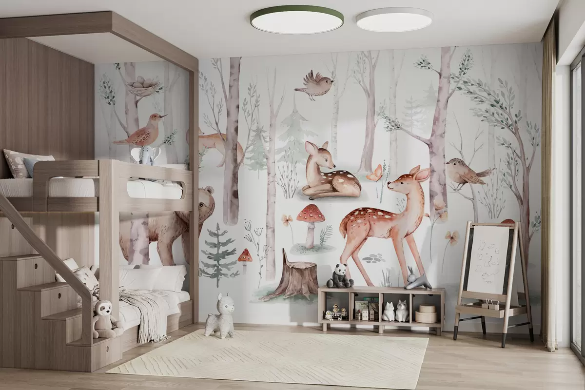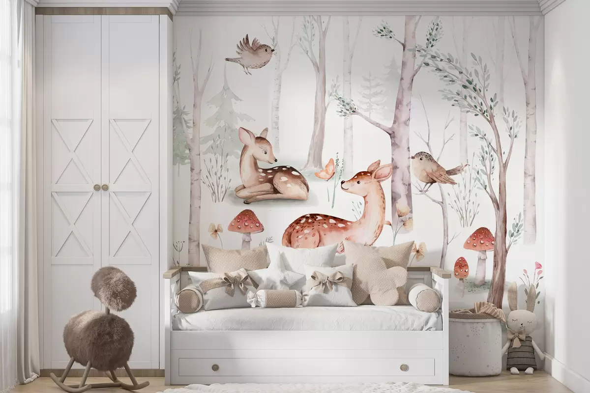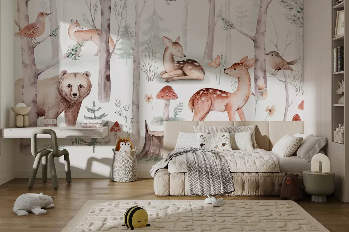 Wallpaper for the children's room, forest animals. Delicate watercolor style wallpaper in pleasant warm pastel colors on a white background - Wall mural (No. w01089)