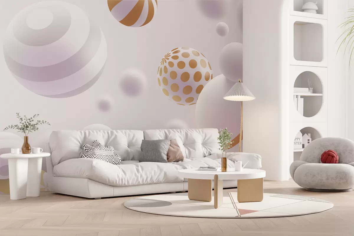 Volumetric 3D-style flying spheres in light gray tones with orange accents - Wall mural (No. w01148)