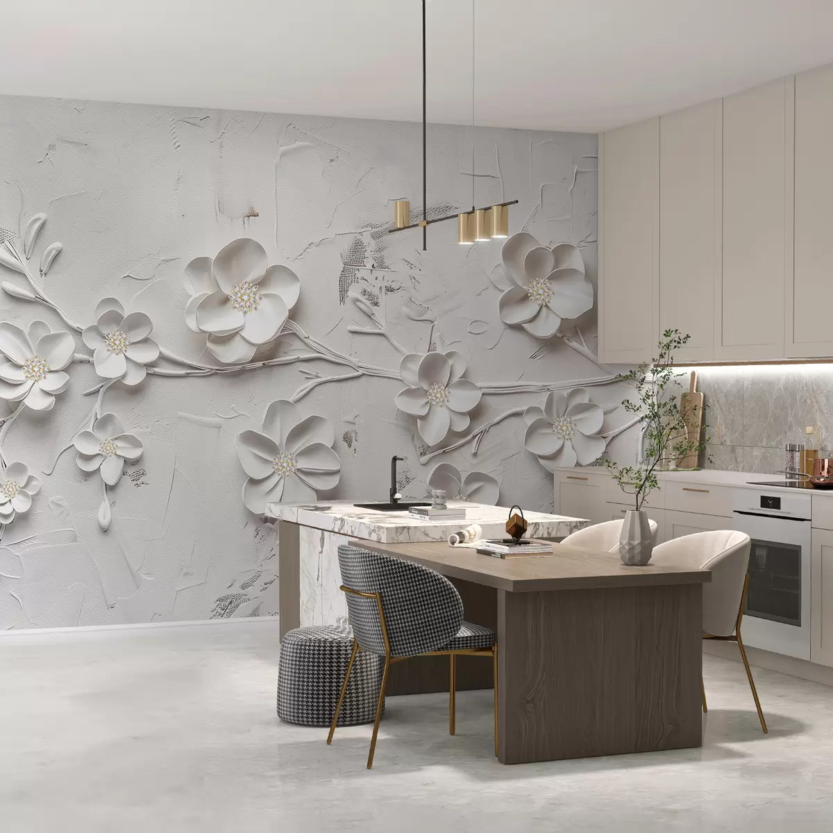 White textured background with 3D white flowers in full bloom, connected by branches, minimalist and elegant - Wall mural (No. w01226)