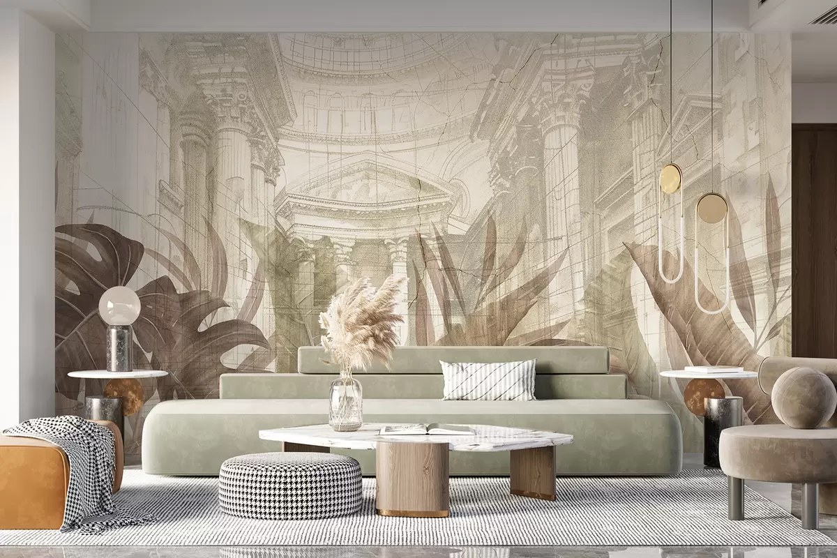 A grand drawing ornate architectural marble columns, and lush tropical sepia plants - Wall mural (No. w01311v1)