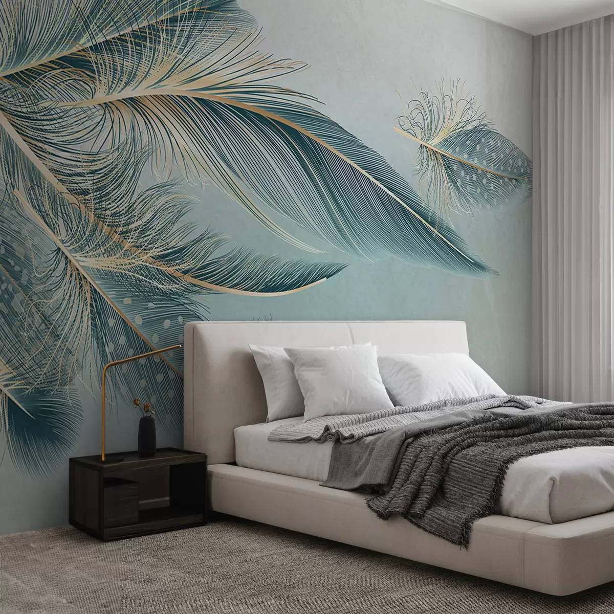 Delicate feathers in shades of blue - Wall mural (No. w01312)