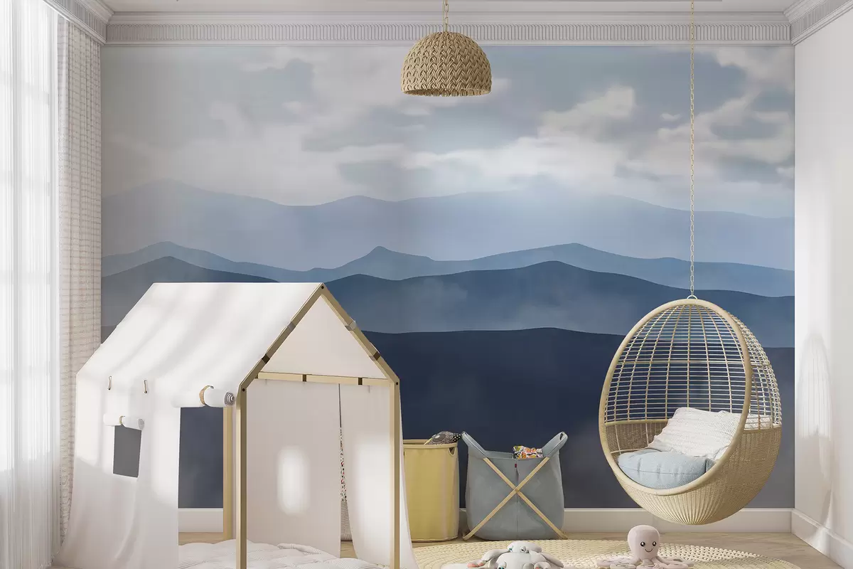 Misty minimalism mountain landscape with rolling hills and cloudy sky - Wall mural (No. w01317)