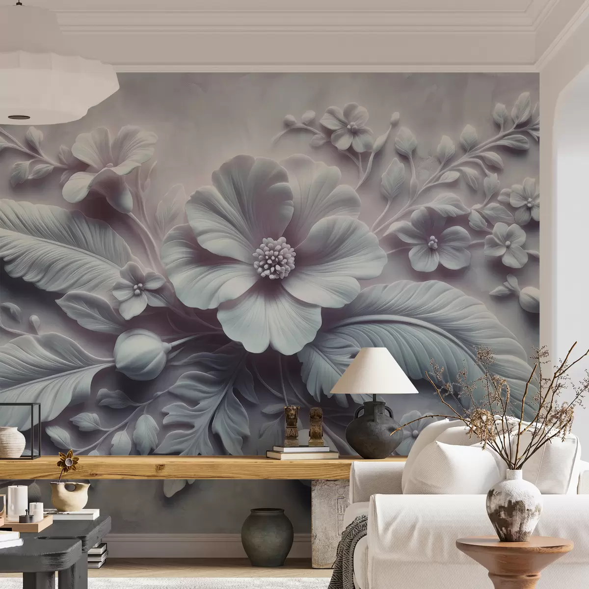 3D relief wall art featuring feathers and flowers, with a large poppy in light blue colors - Wall mural (No. w01340v2)