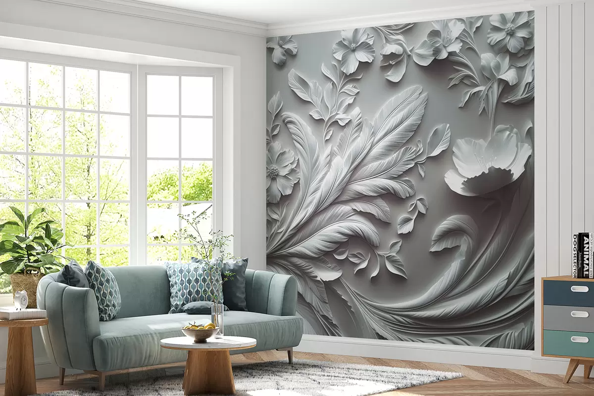 Exquisite raised flowers and leaves in gray tones - Wall mural (No. w01356v2)
