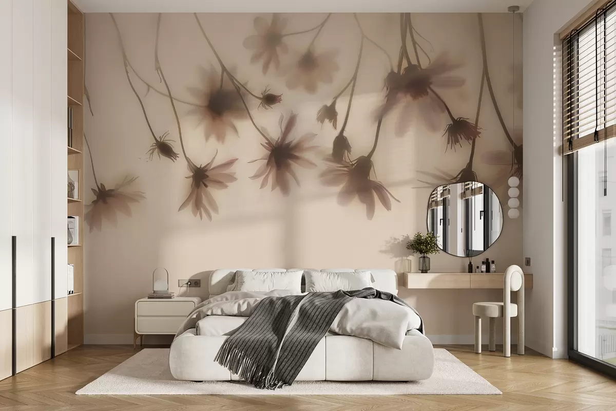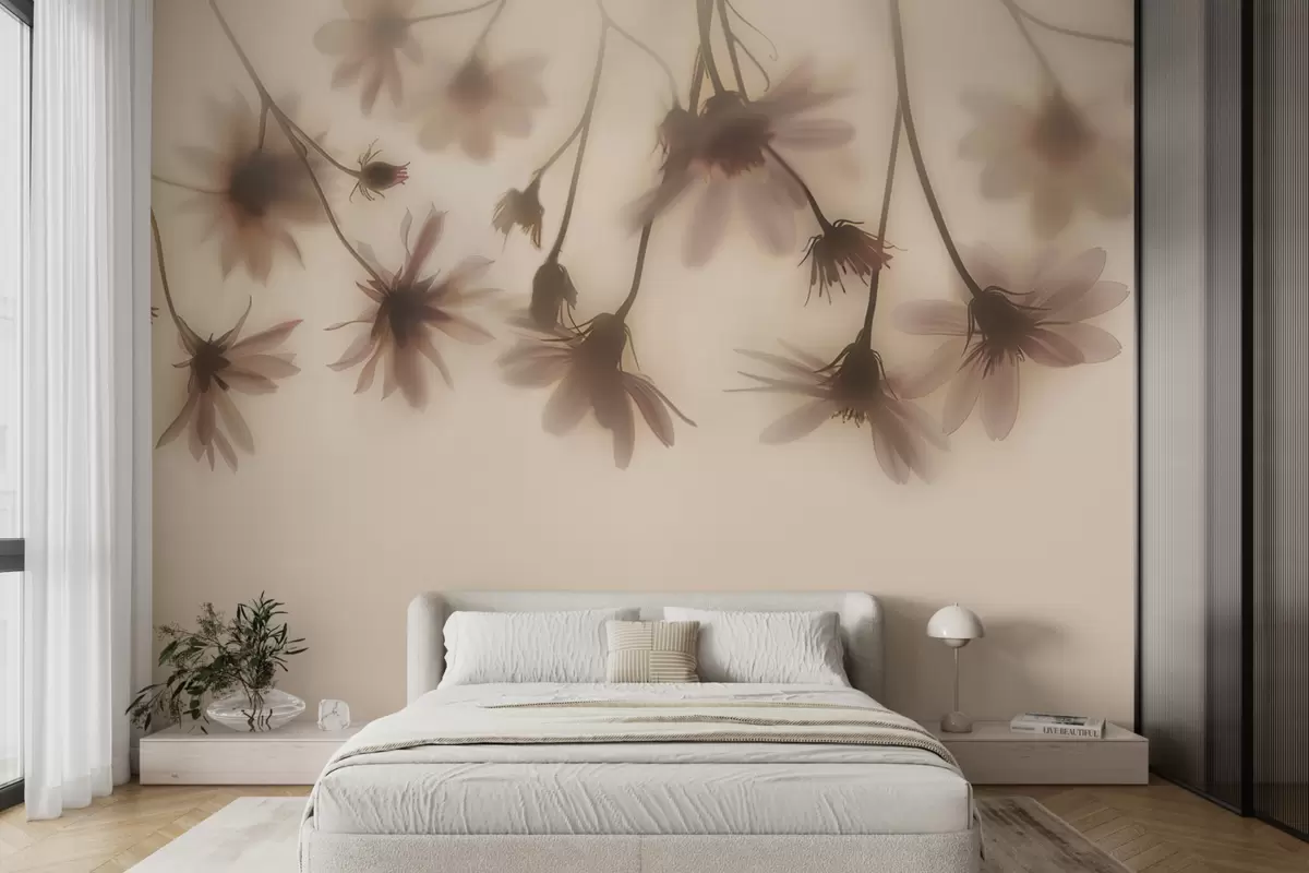 Delicate flowers in the fog hanging from above in pink colors - Wall mural (No. w01469)