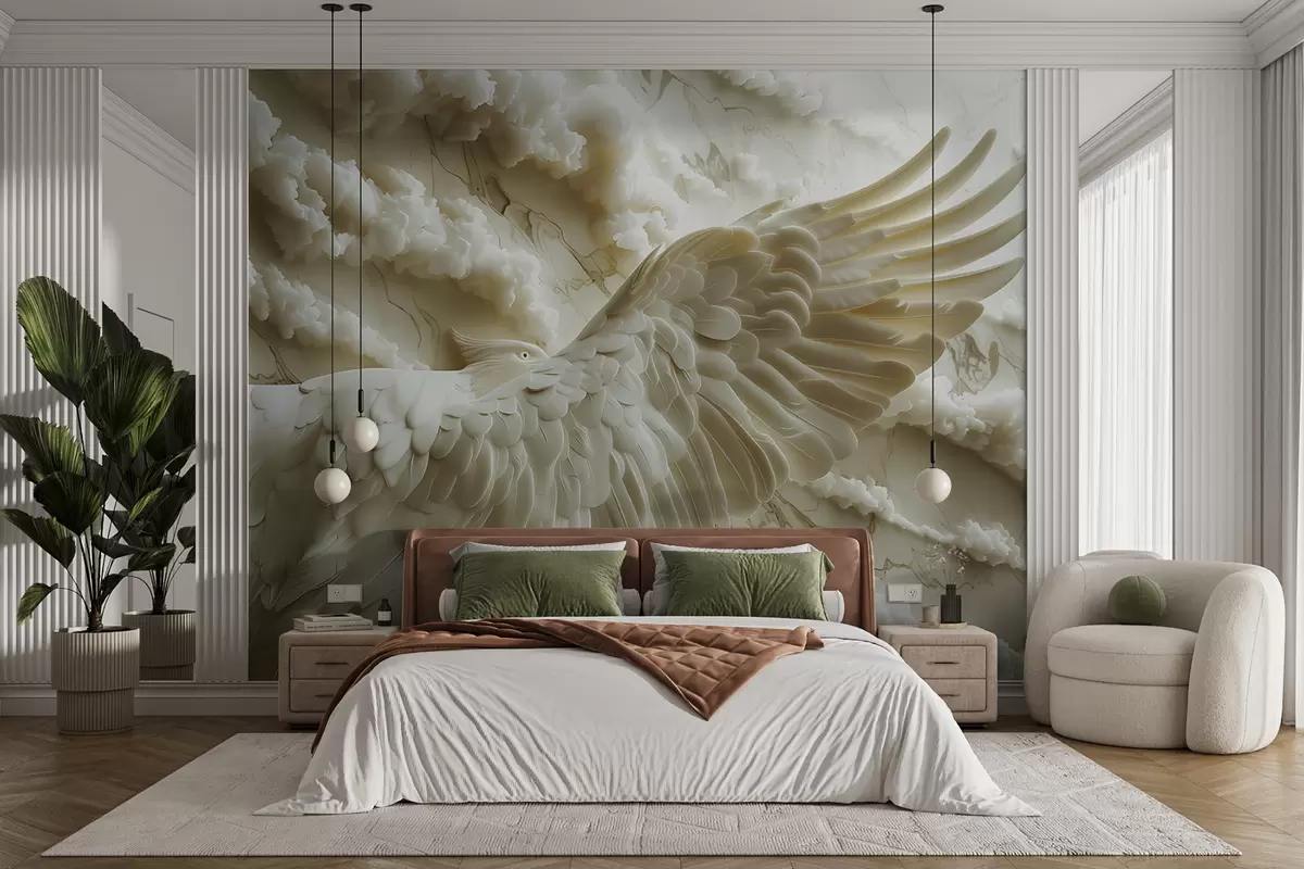 3D flying white eagle on a background of clouds and marble - Wall mural (No. w01476)