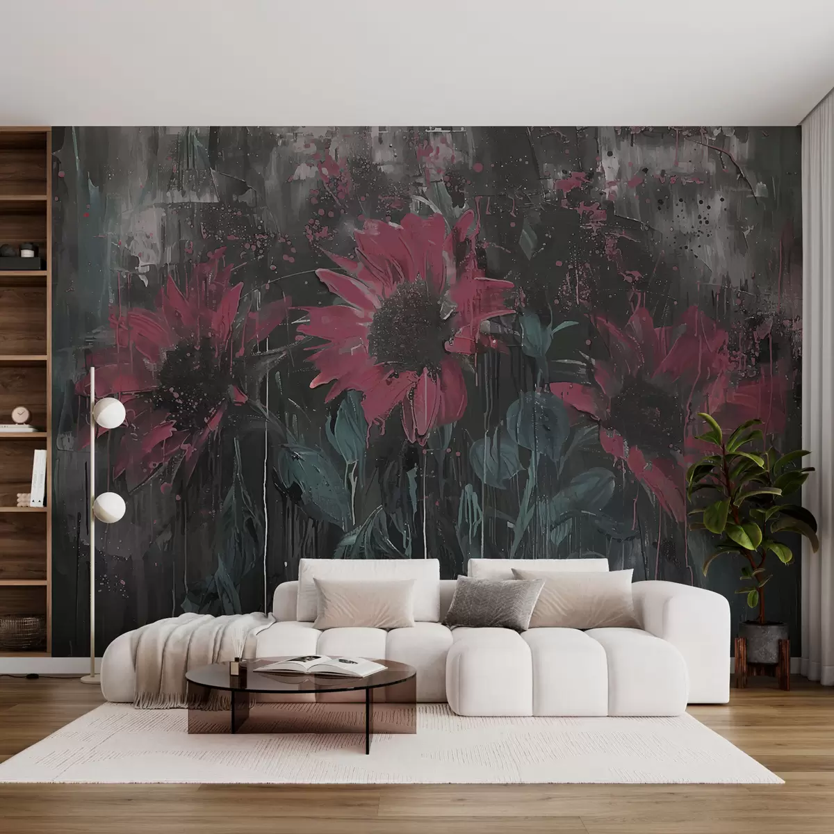 Abstract sunflower picture, dark gray background and red-pink tones - Wall mural (No. w01480v1)