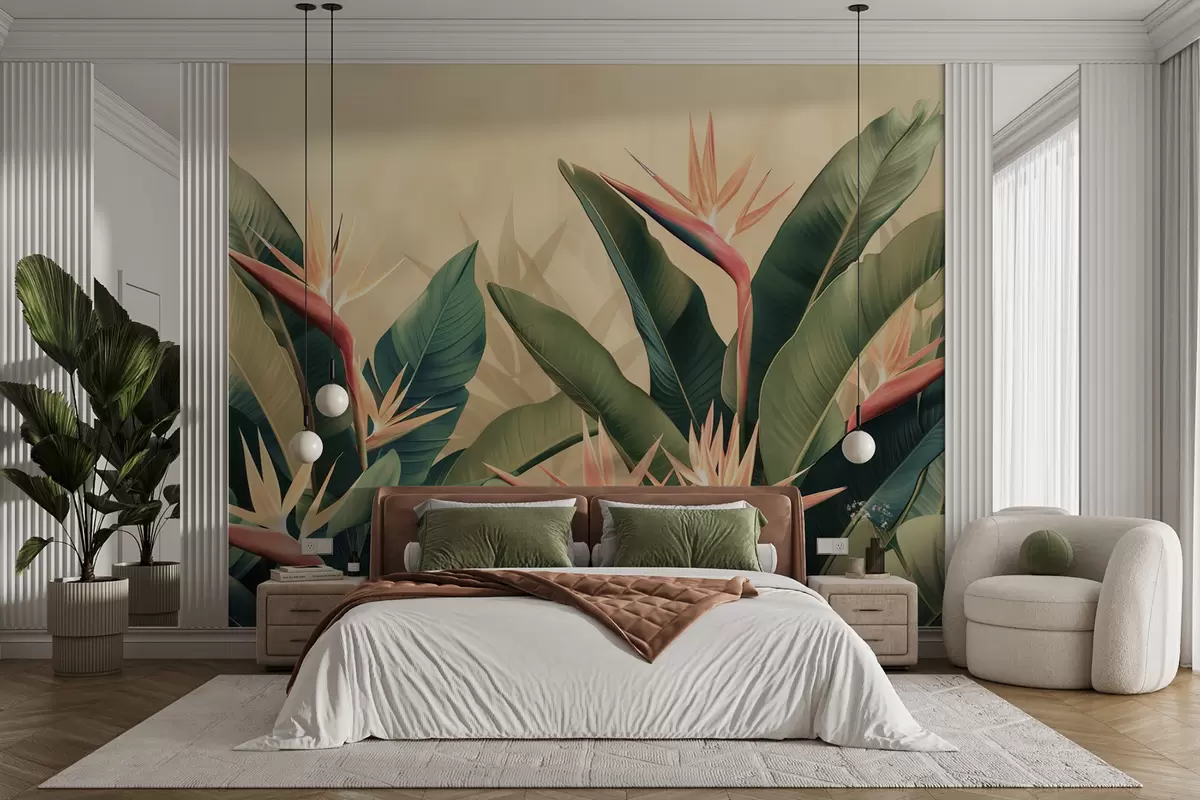 Lush arrangement of tropical flowers surrounded by large dark green leaves - Wall mural (No. w01484v1)