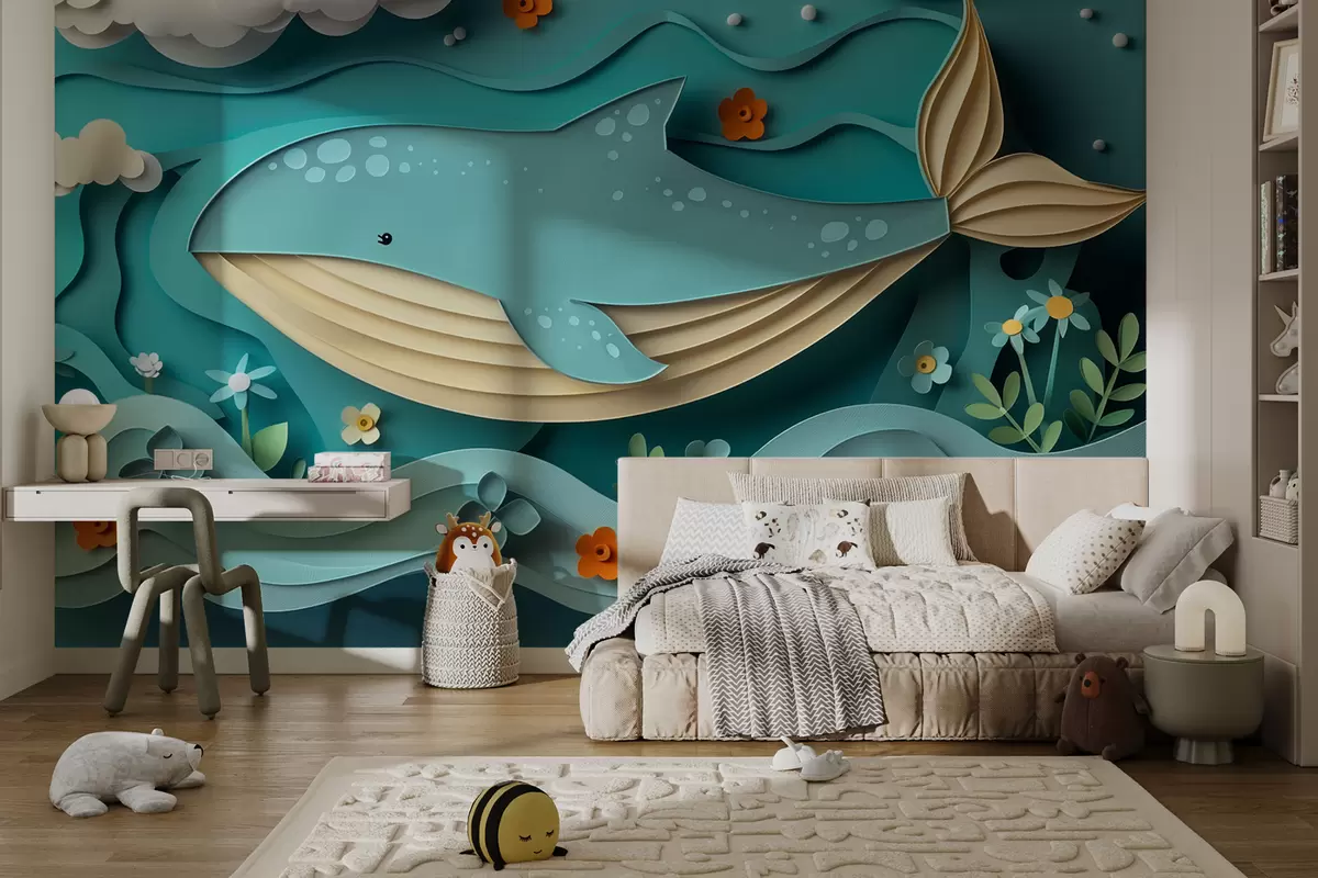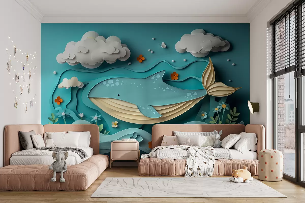Playful whale in the clouds in paper cut style, 3D effect - Wall mural (No. w01496)