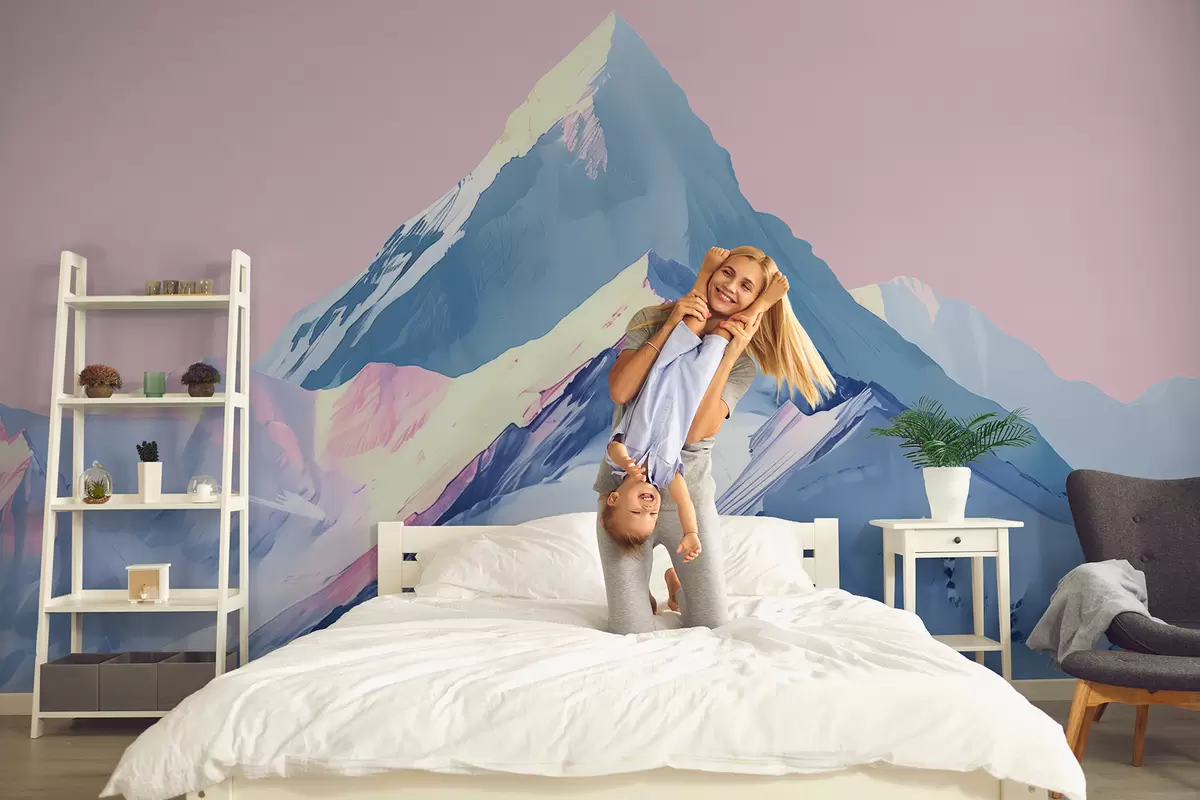 Blue and pink mountains in drawn style - Wall mural (No. w01497)