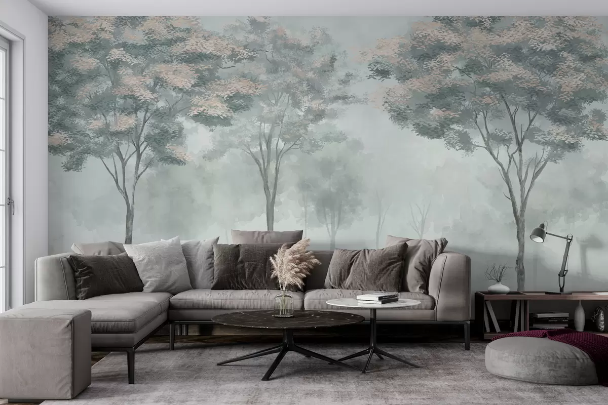 Misty forest silhouette in green, light gray and beige colors - Wall mural (No. w01599)