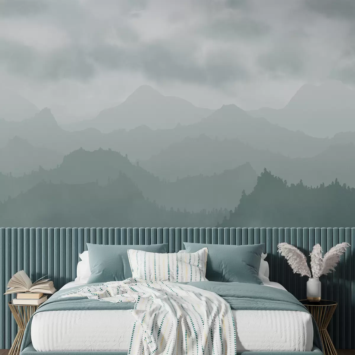 Foggy mountains with cirrus blue clouds in the sky - Wall mural (No. w01637v2)