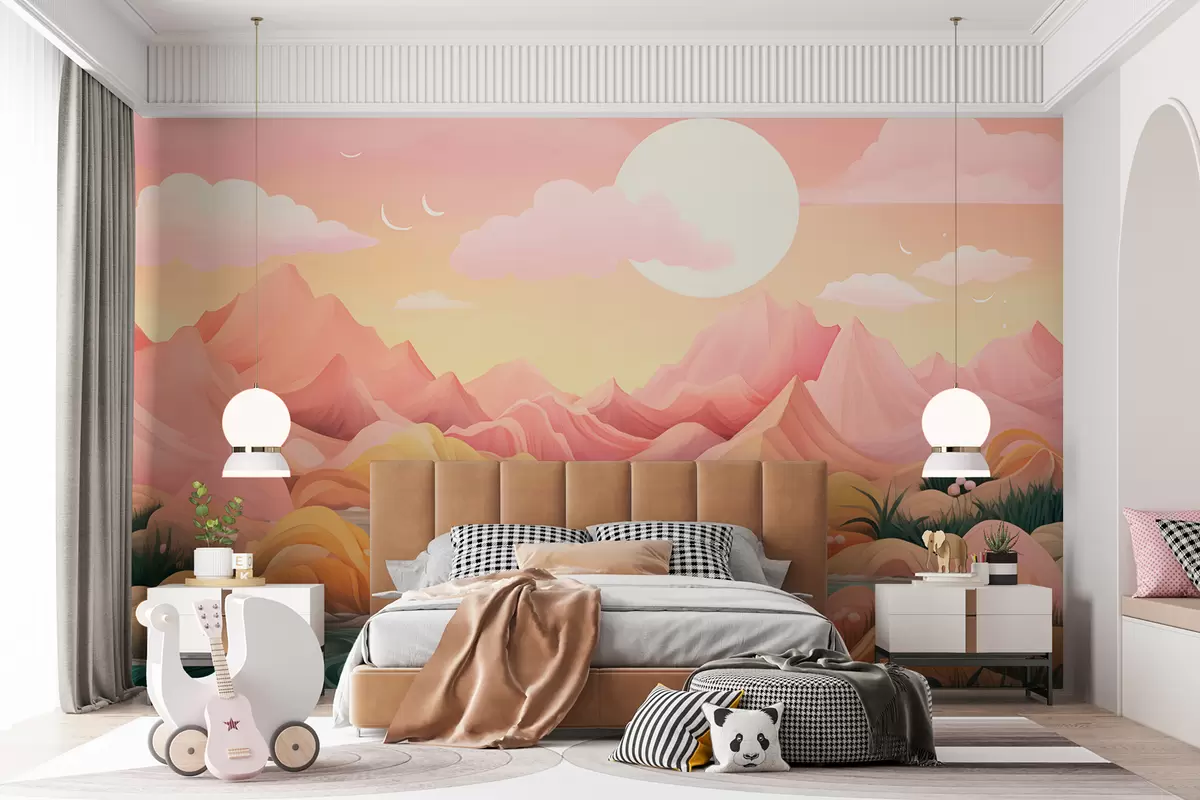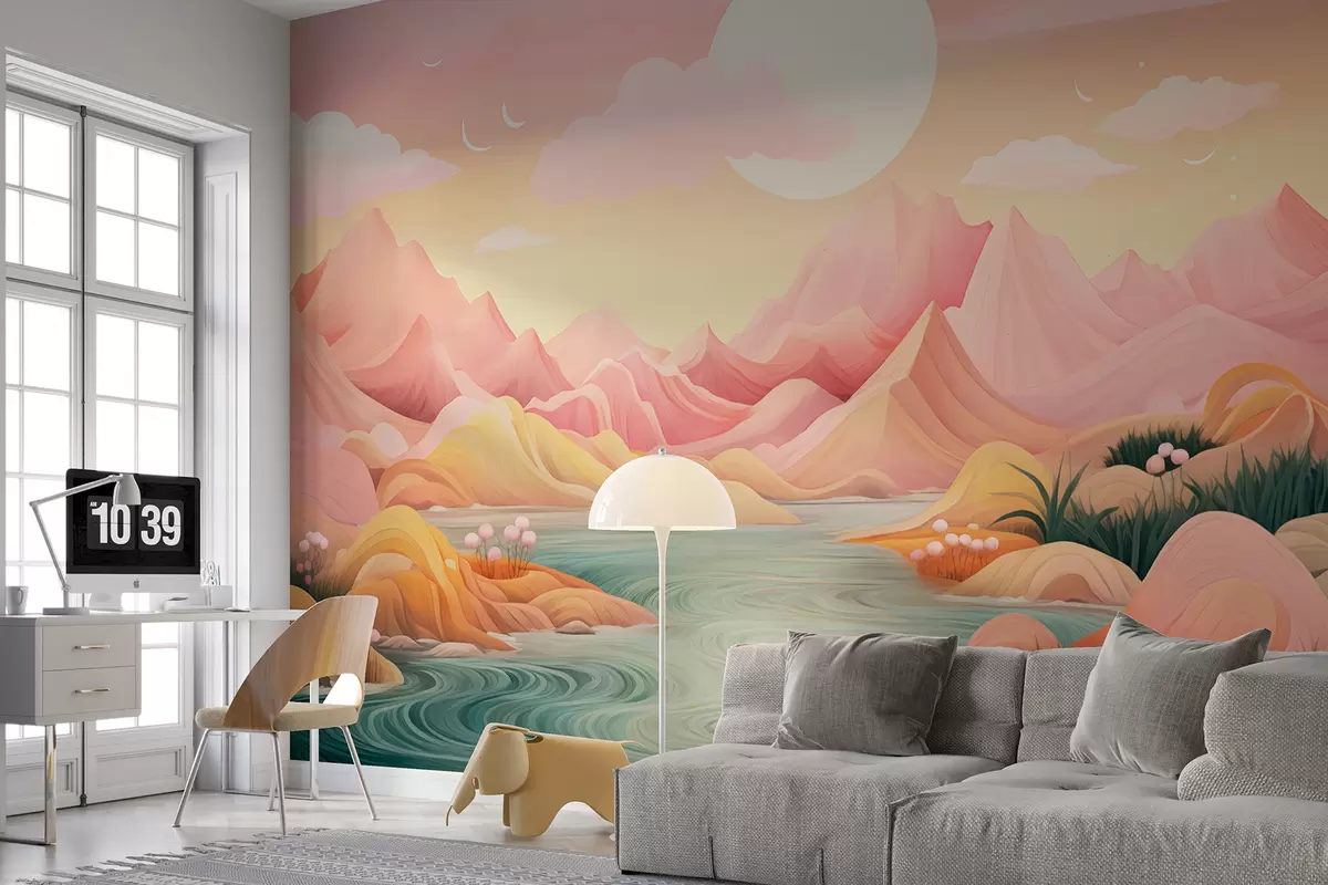 Fantastical, pastel-colored landscape with soft pink and peach mountains - Wall mural (No. w01656)