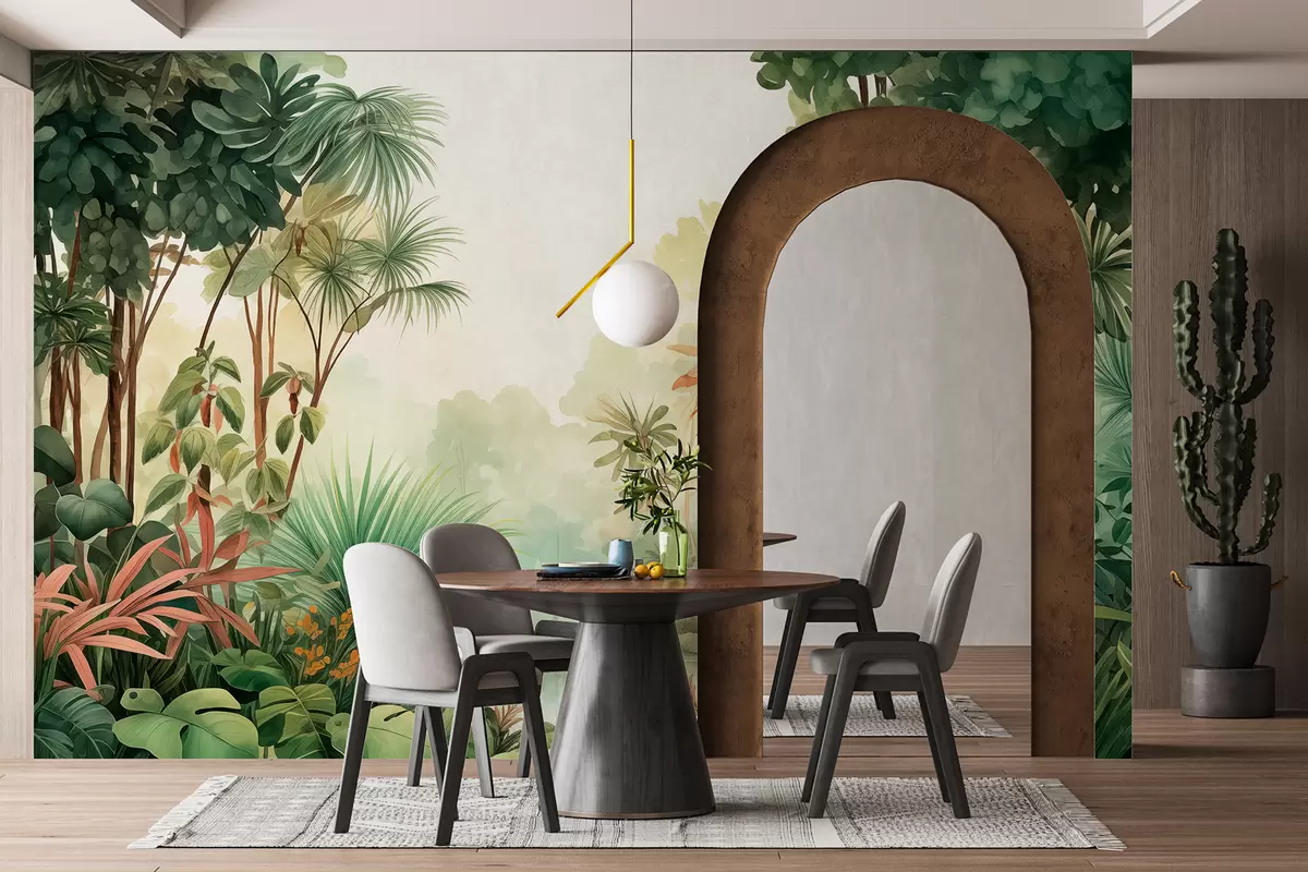 Watercolor jungle forest, palm trees, lake, greenery - Wall mural (No. w01784)