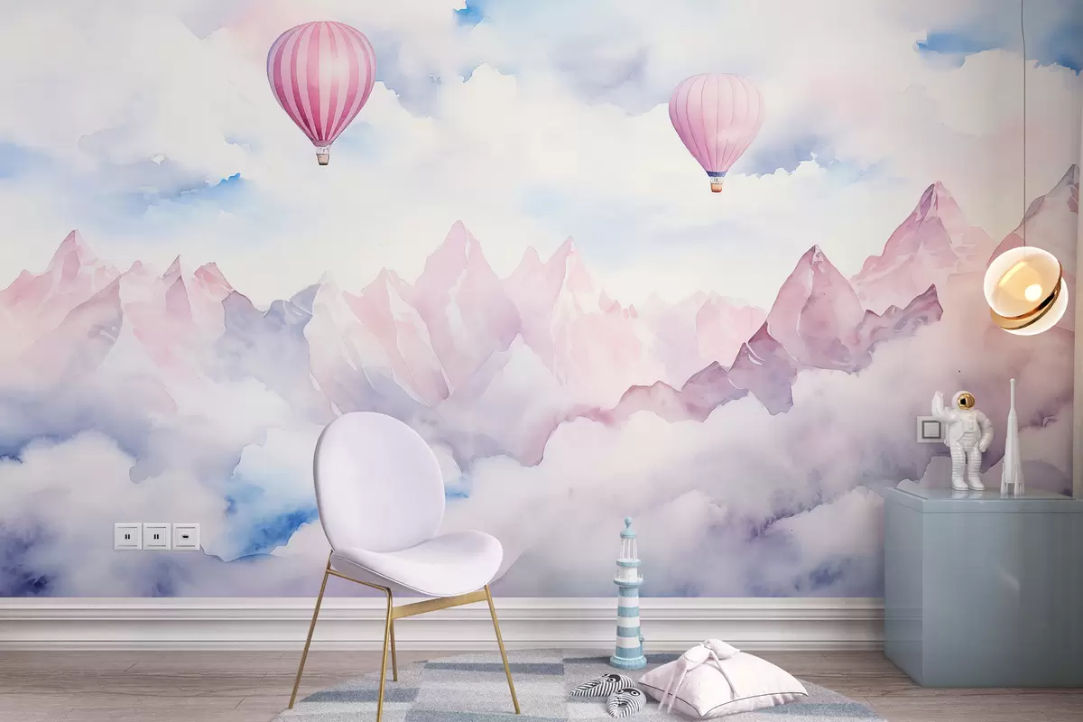 Beautiful mountains landscape with air ballons, watercolor - Wall mural (No. w01792)