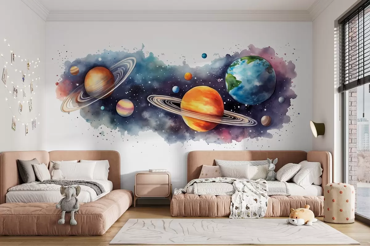Watercolor planets, space, cosmic, Earth, Saturn - Wall mural (No. w01802)