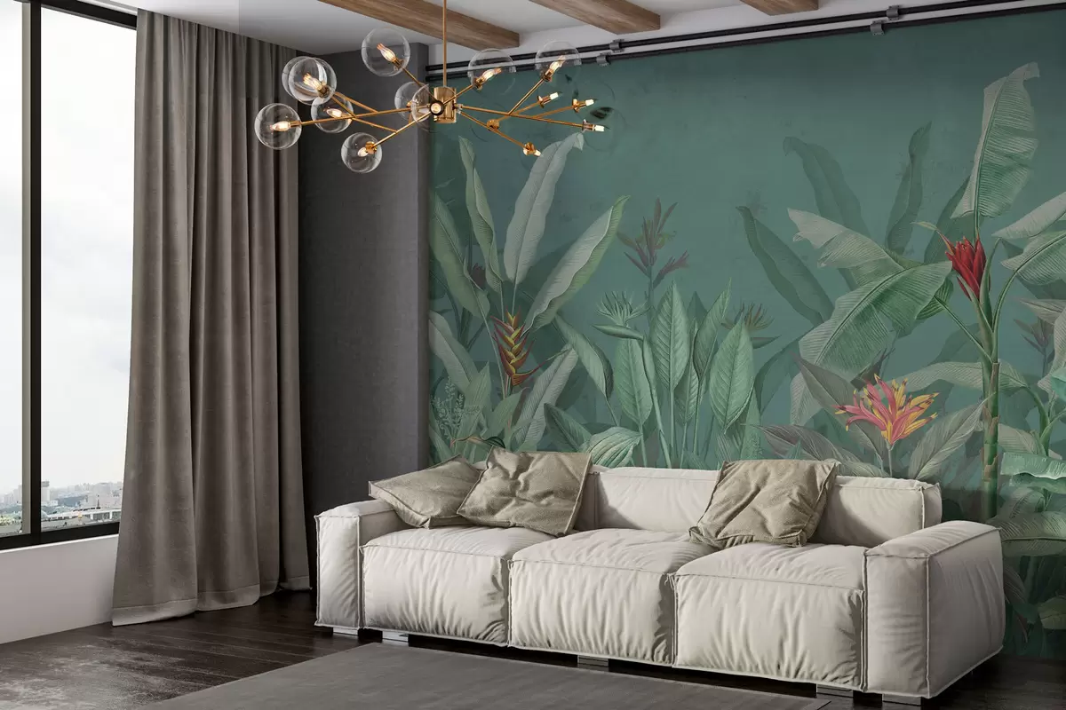 Tropical leaves and flowers on a green background - Wall mural (No. w01834v2)