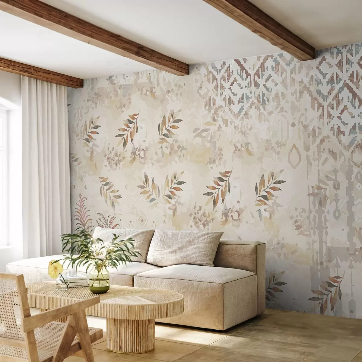 retro-style wallpaper with patterns, elements of abrasion, stains and leaves, in beige colors - Wall mural (No. w01955)