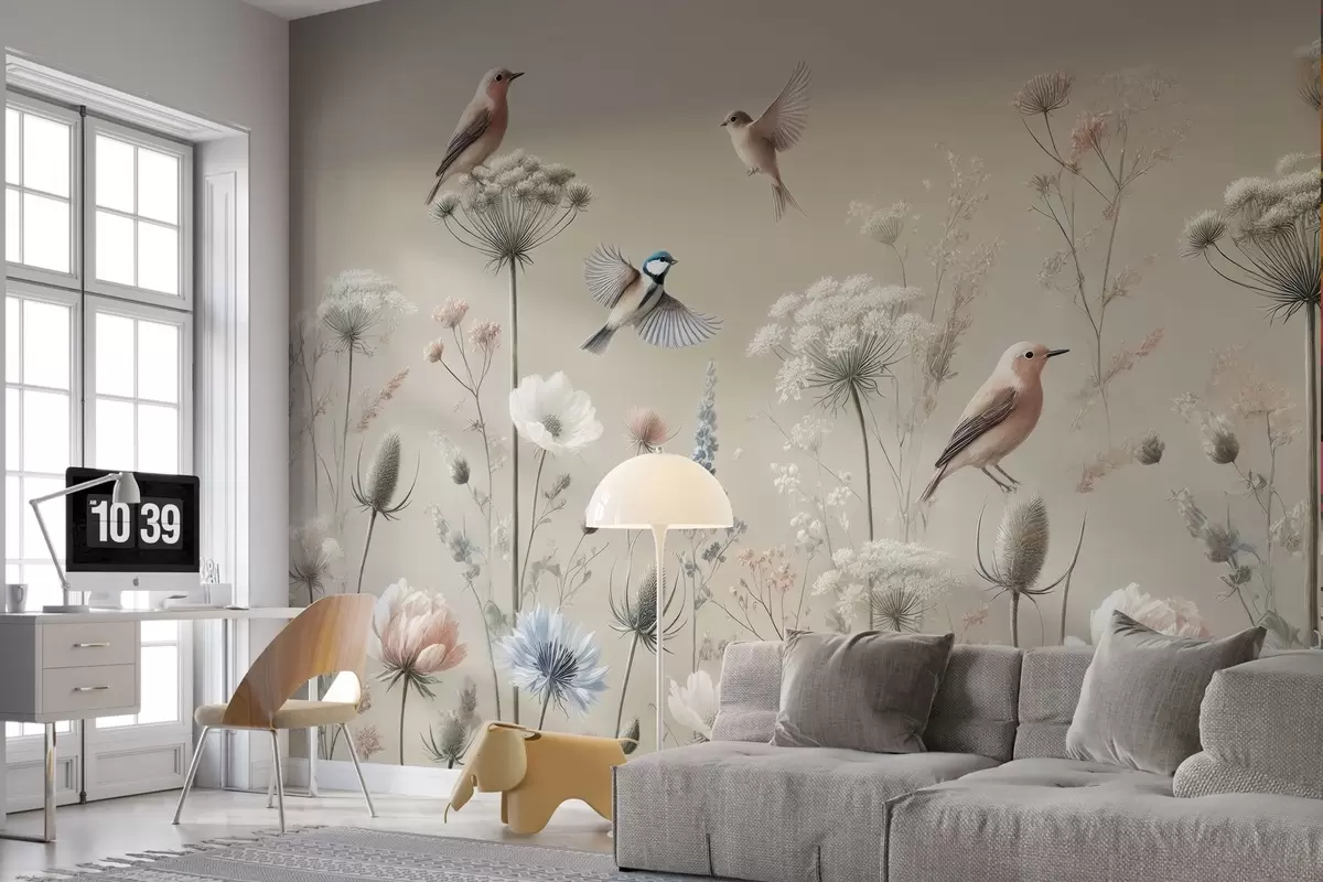 Delicate wildflowers with birds on a beige background - Wall mural (No. w01958)