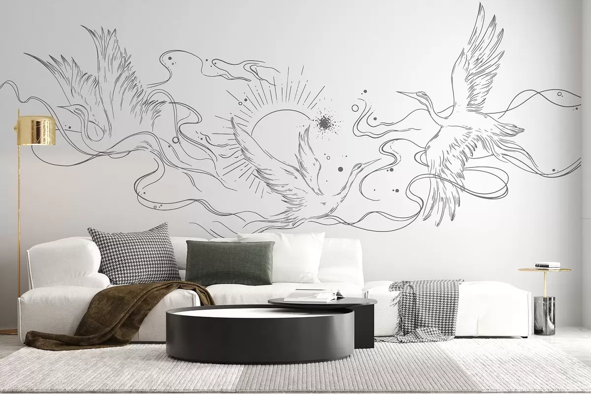 Flying birds, line drawing, minimalism, grey color palette - Wall mural (No. w02022v2)