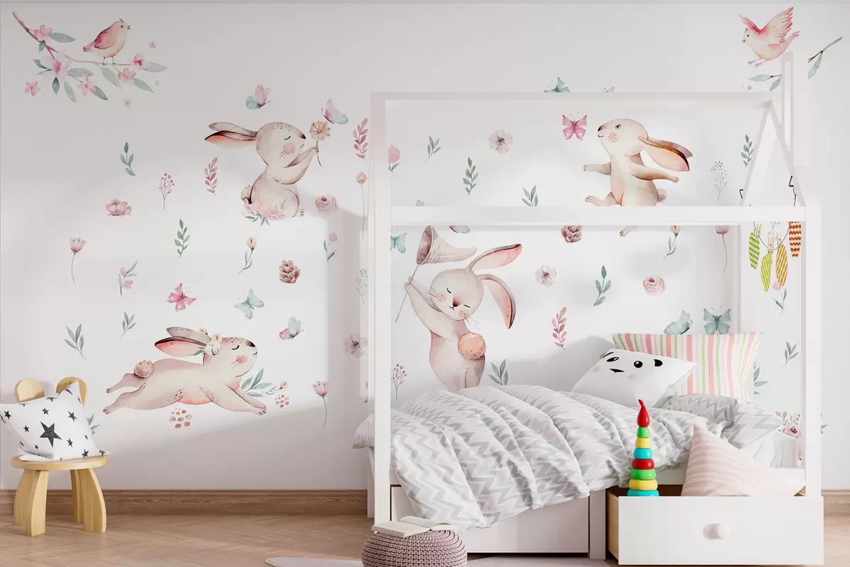 Fairy tale bunnies in flowers - Wall mural (No. w02025)