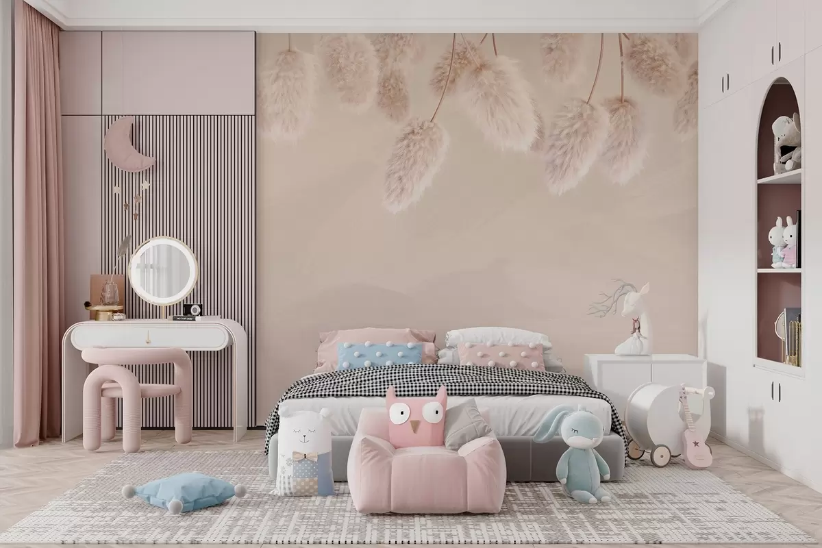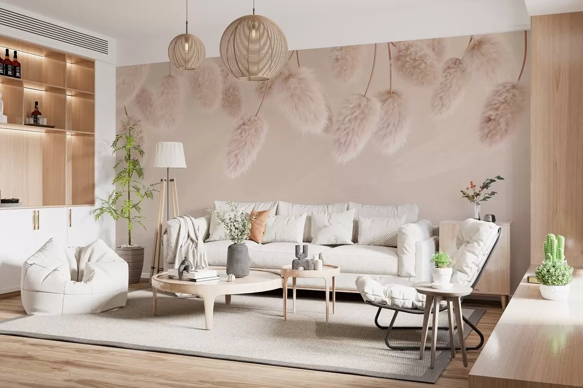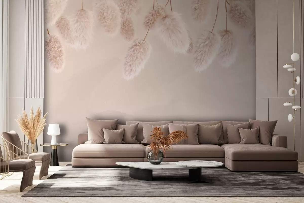 Gentle clouds of lagurus against a background of soft pink strokes - Wall mural (No. w02071)
