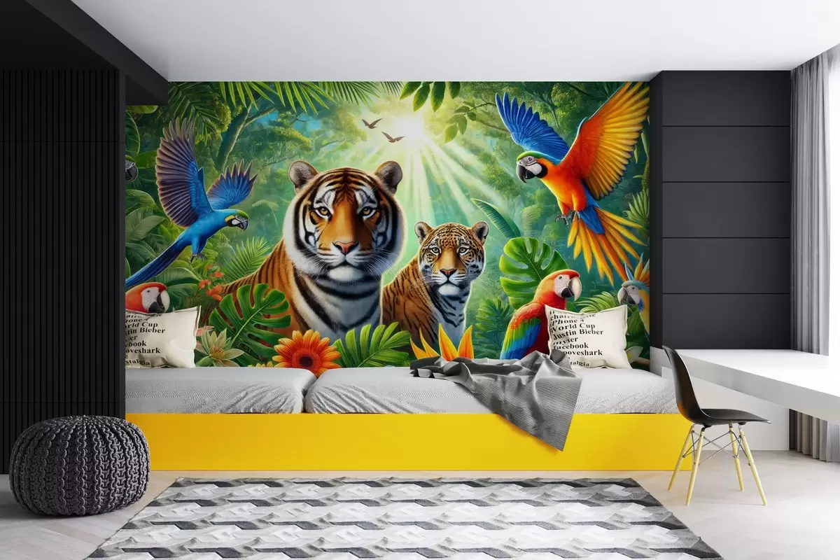 Colorful wall mural with a panorama of the tropics with a pair of tigers, parrots and flowers - Wall mural (No. w02083)