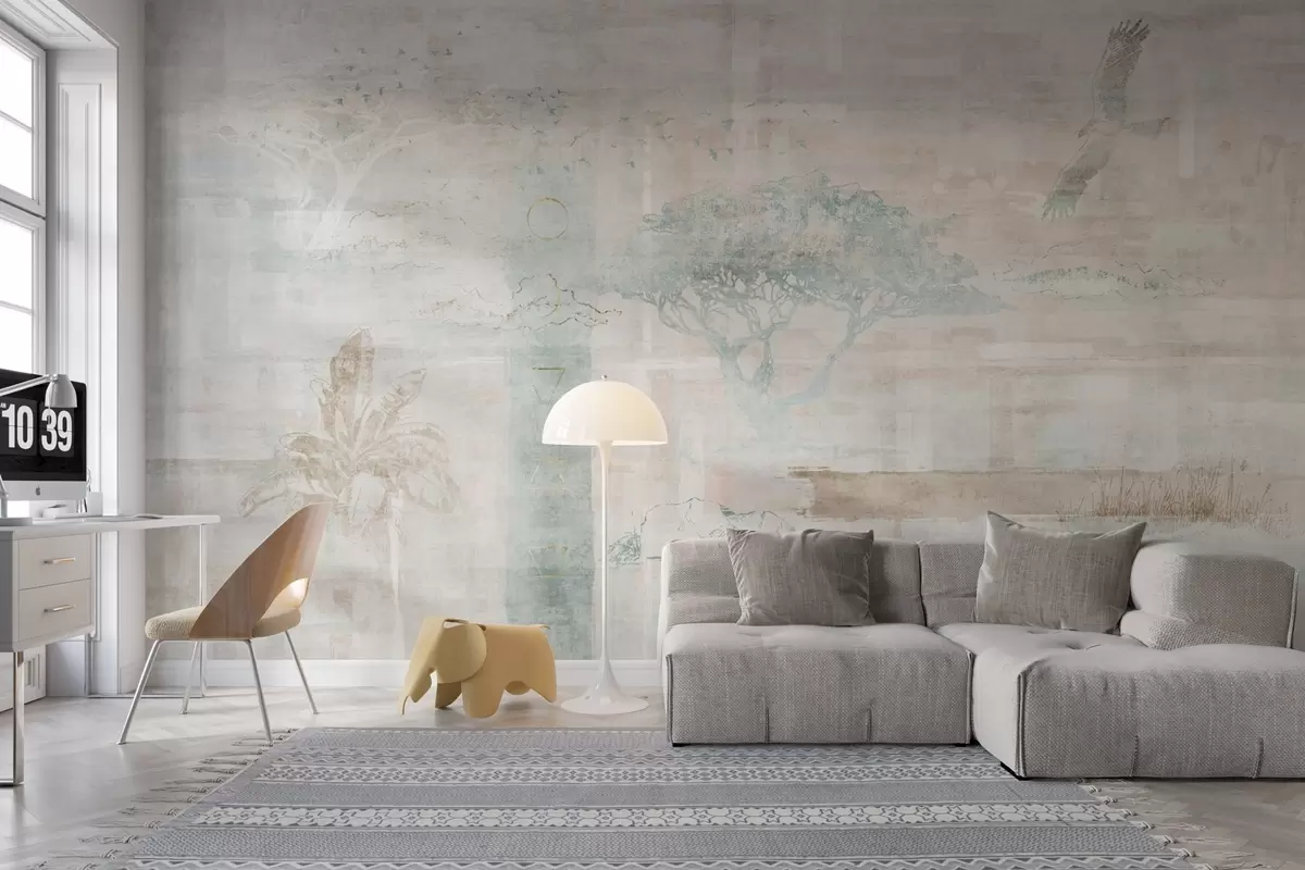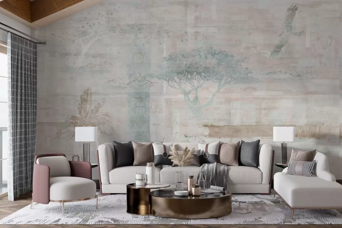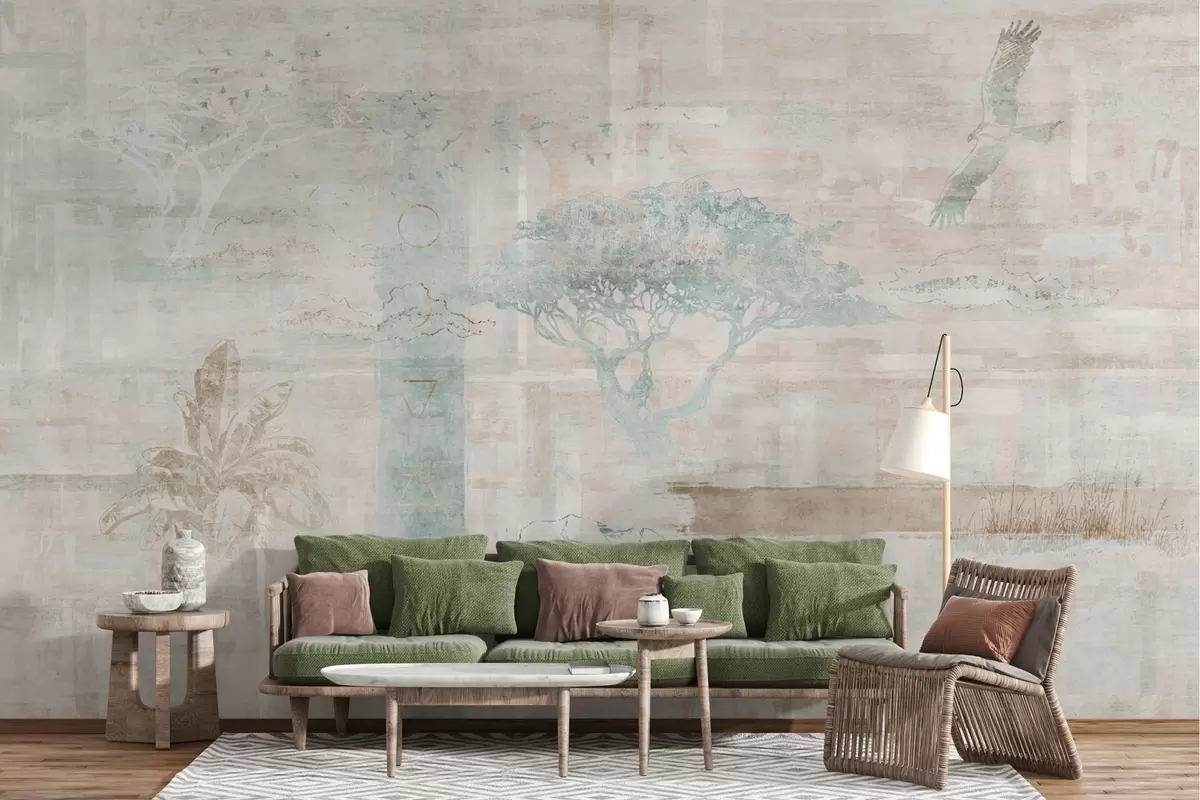 Vintage grunge effect design with trees, eagle and geometric elements - Wall mural (No. w02130)