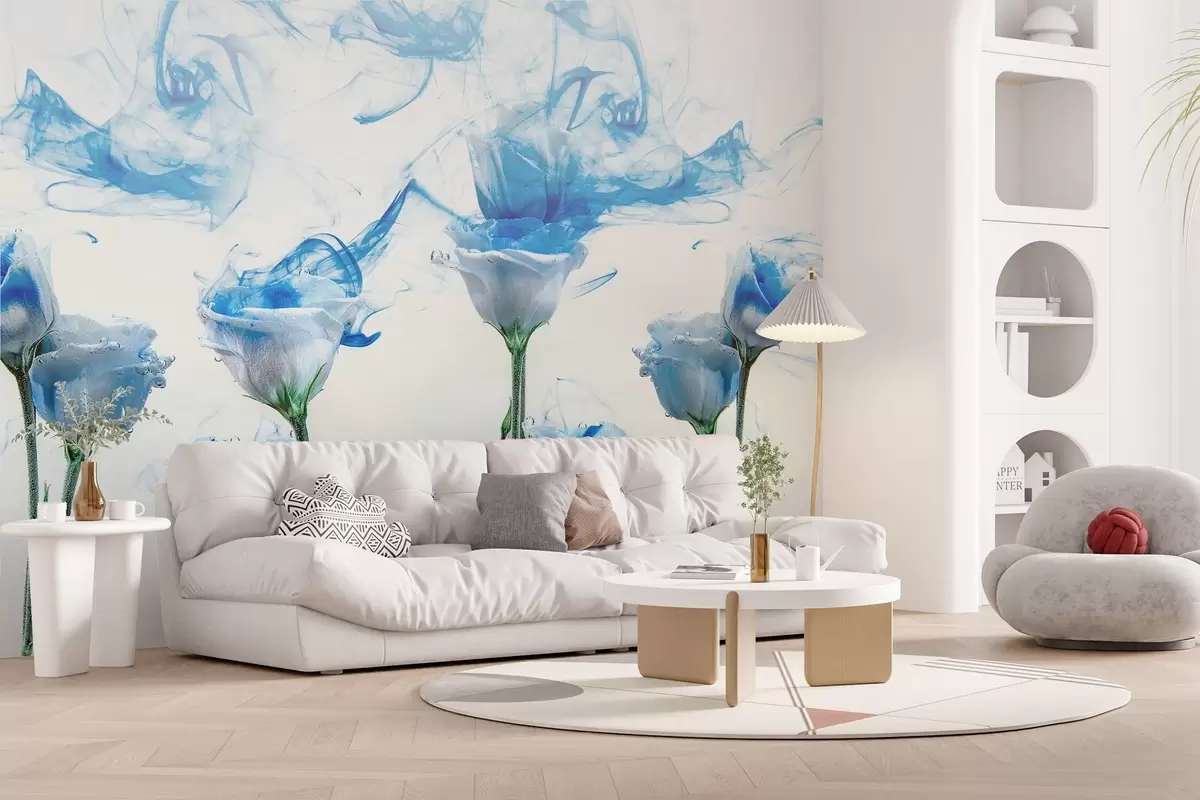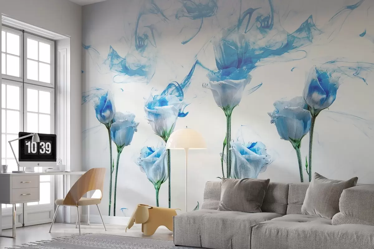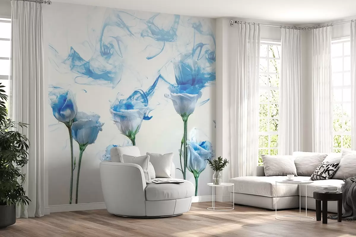 White roses underwater on a white background with blue acrylic paint streaks. - Wall mural (No. w02139)