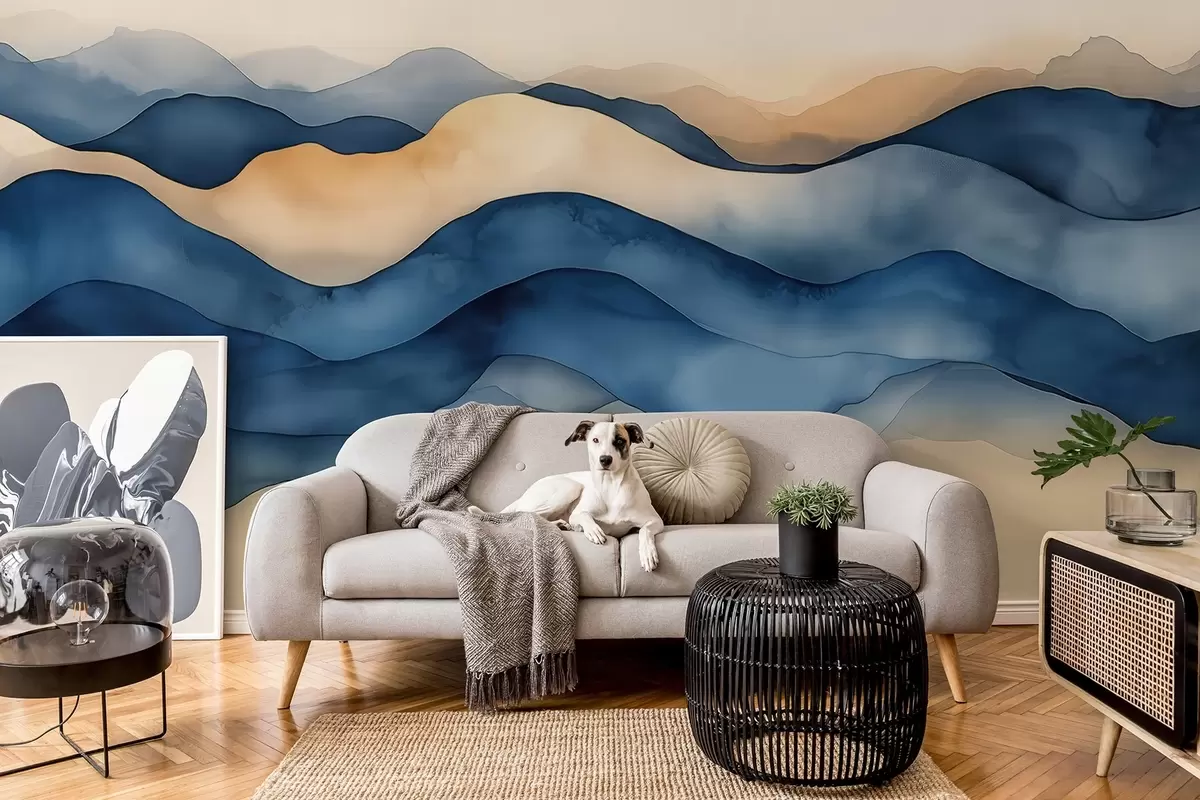 Abstract blue-beige waves reminiscent of mountains - Wall mural (No. w02196)