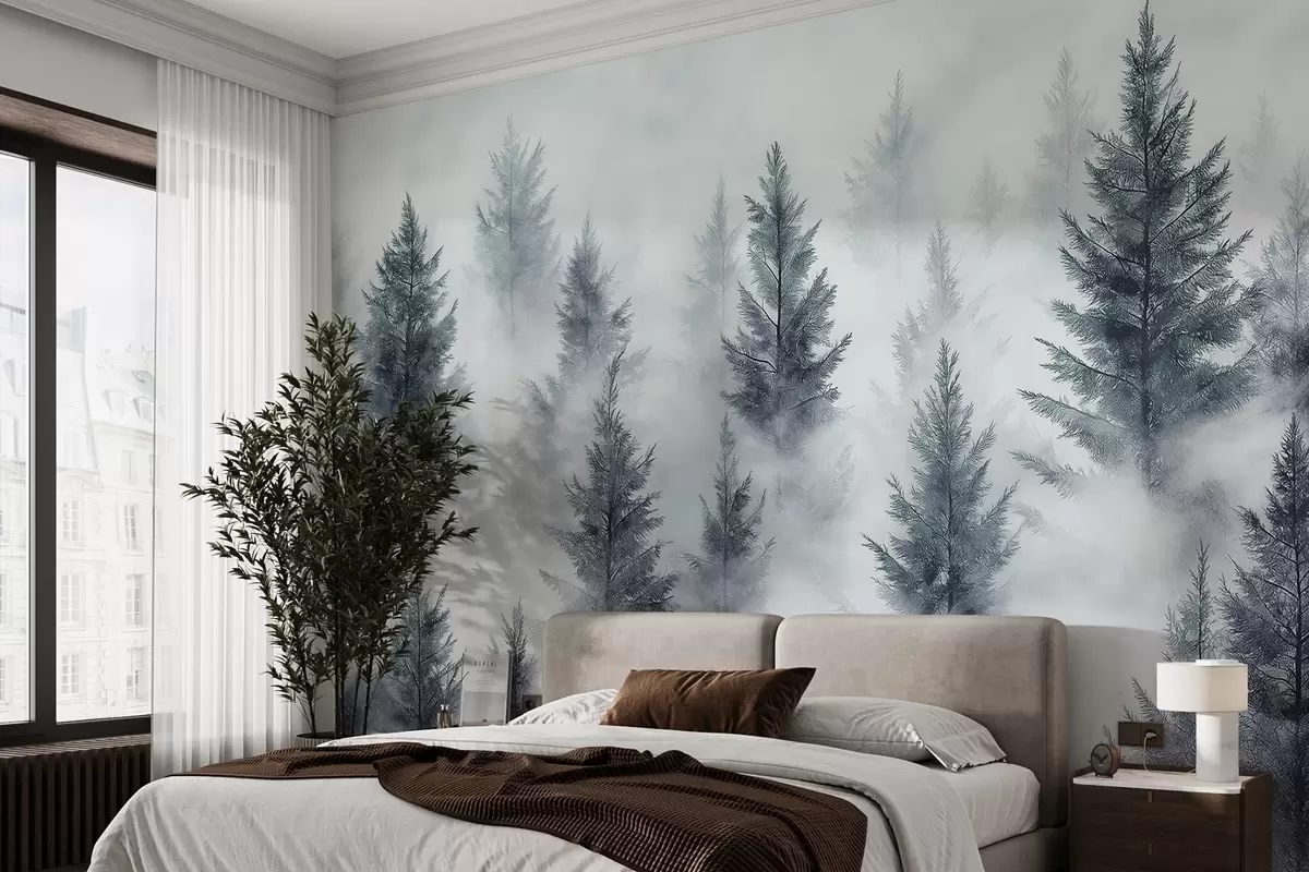 Beautiful forest with pine trees, fog, nature landscapes, grey colors - Wall mural (No. w02222v2)
