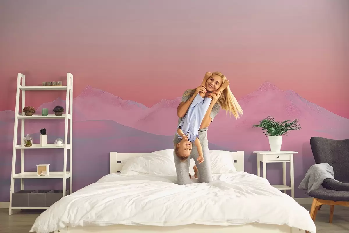 Soft raspberry sunset against the backdrop of mountains and sky - Wall mural (No. w02234)