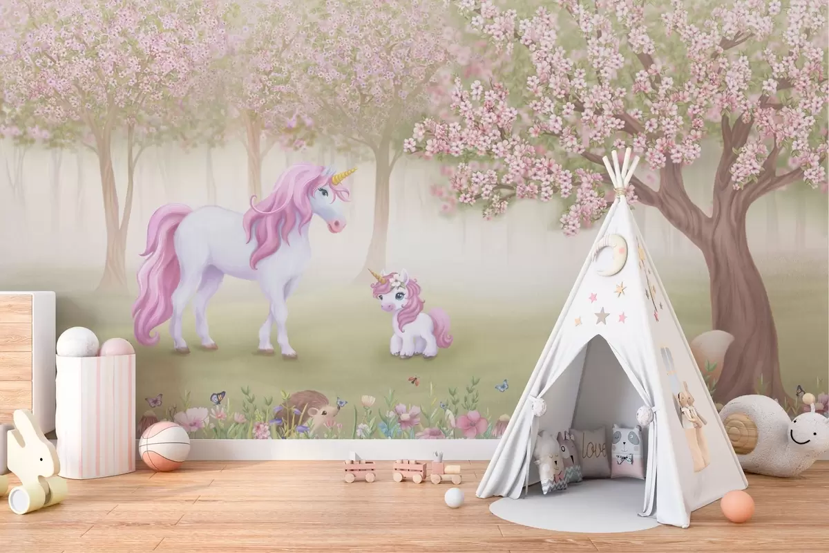 Unicorns in a magical forest with animals - Wall mural (No. w02269)