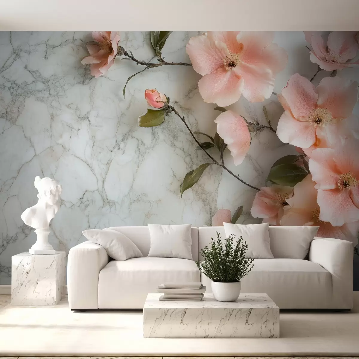 Delicate flowers on the background of marble imitation - Wall mural (No. w02291)