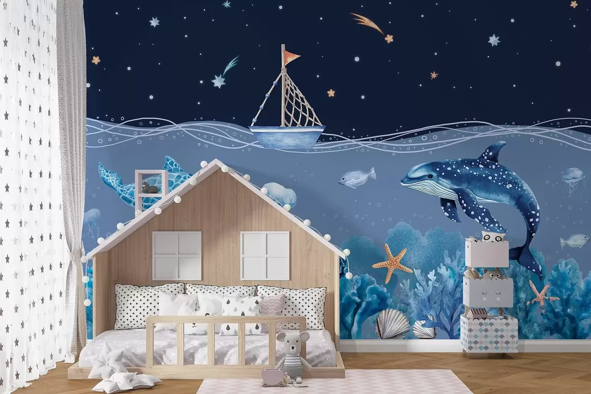 Sea life, watercolor style, corals, boat, dolphin, jellyfish, starry night sky, blue colors - Wall mural (No. w02310)