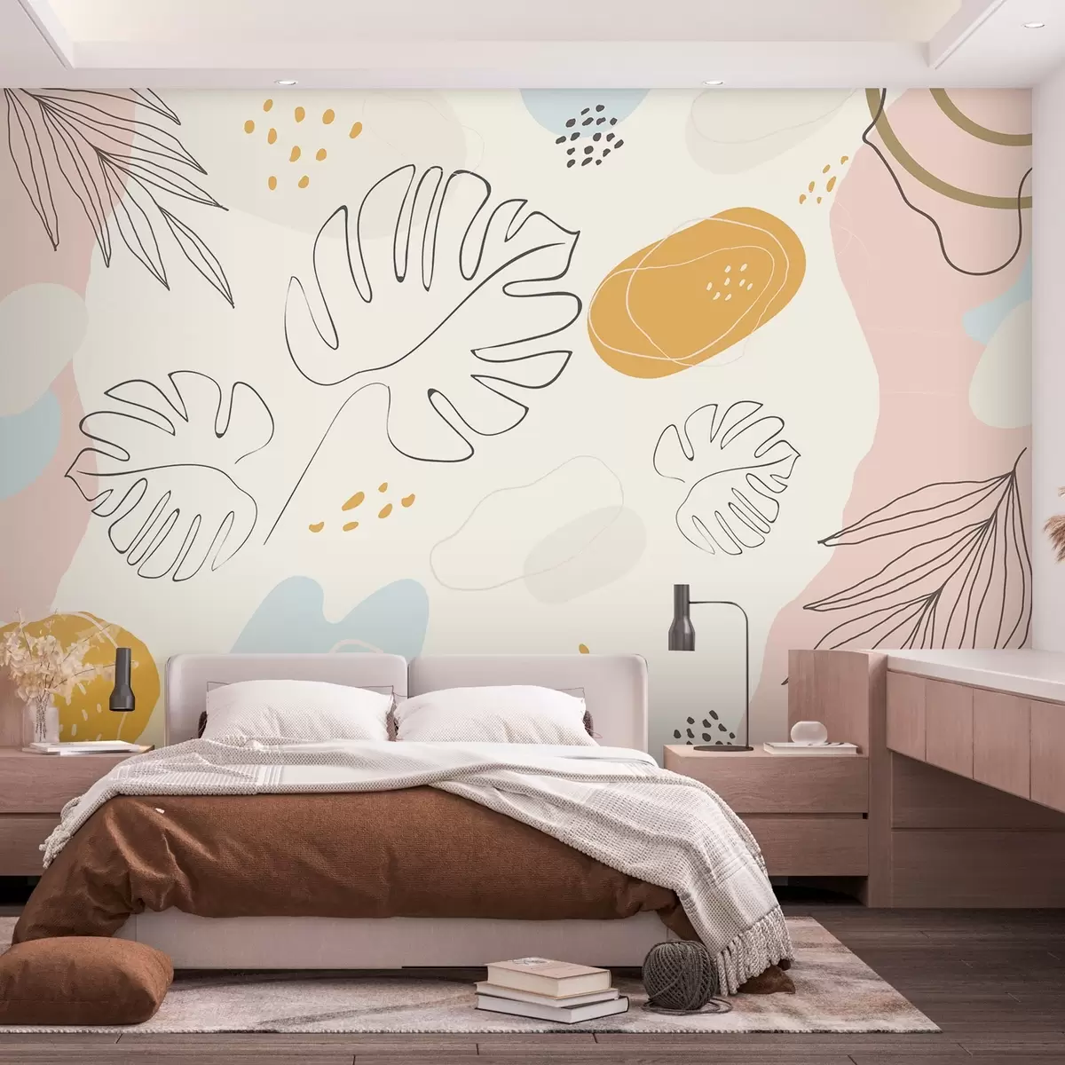 Boho design with leaves and figures in pastel colors - Wall mural (No. w02322)