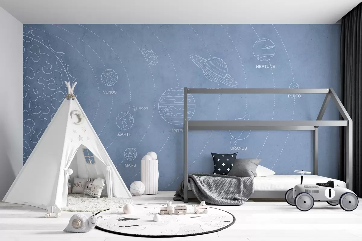 Solar system in a minimalist style on a blue textured background - Wall mural (No. w02344v1)