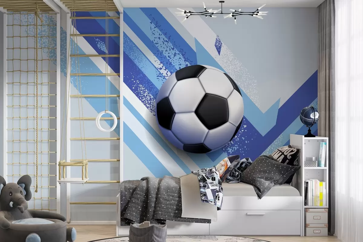 soccer ball on dynamic abstract background in blue colors - Wall mural (No. w02347)