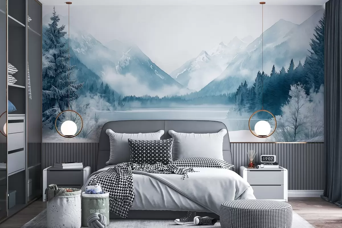 Winter mountains, frozen lake, pine forest, blue color palette, watercolor style - Wall mural (No. w02354)
