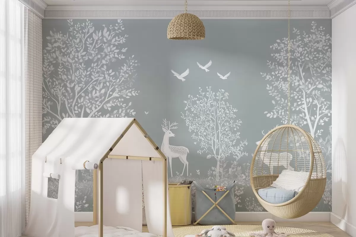 forest with deer in the style of a chalk drawing on a gray background - Wall mural (No. w02444v2)