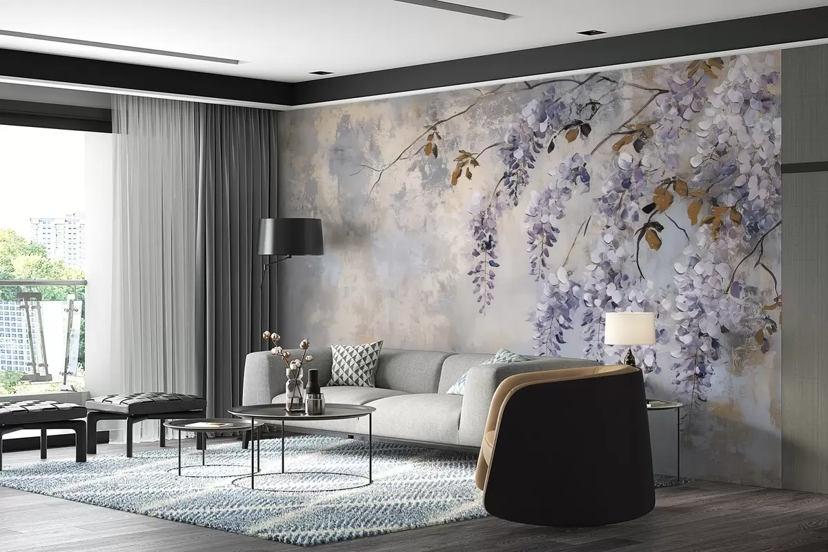 textured wallpaper in soft, muted colors with delicate wisteria flowers and branches. - Wall mural (No. w02451)