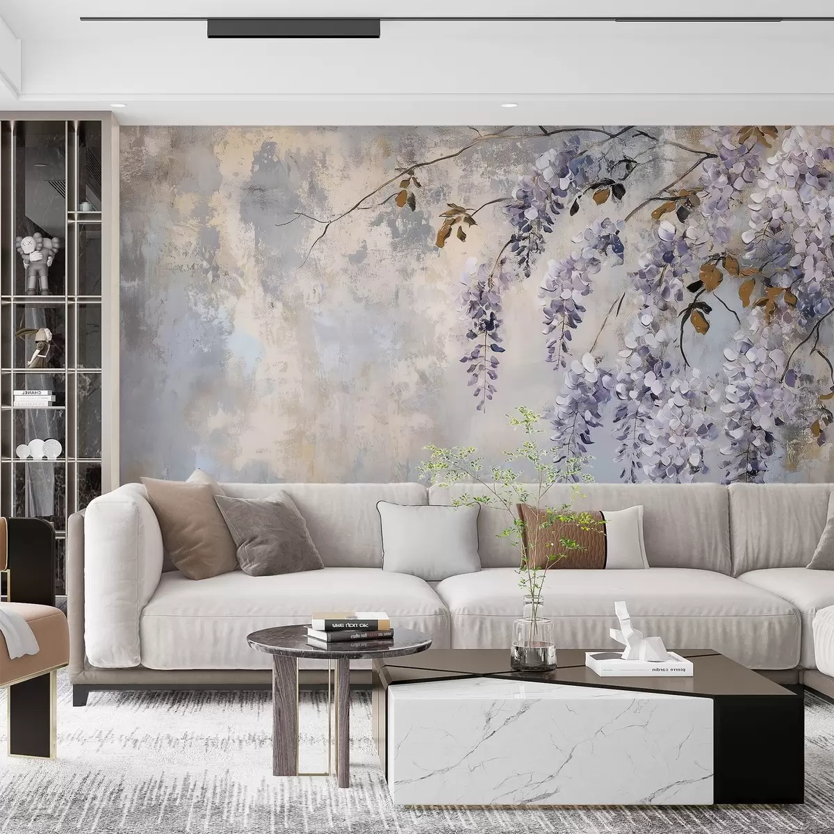 textured wallpaper in soft, muted colors with delicate wisteria flowers and branches. - Wall mural (No. w02451)