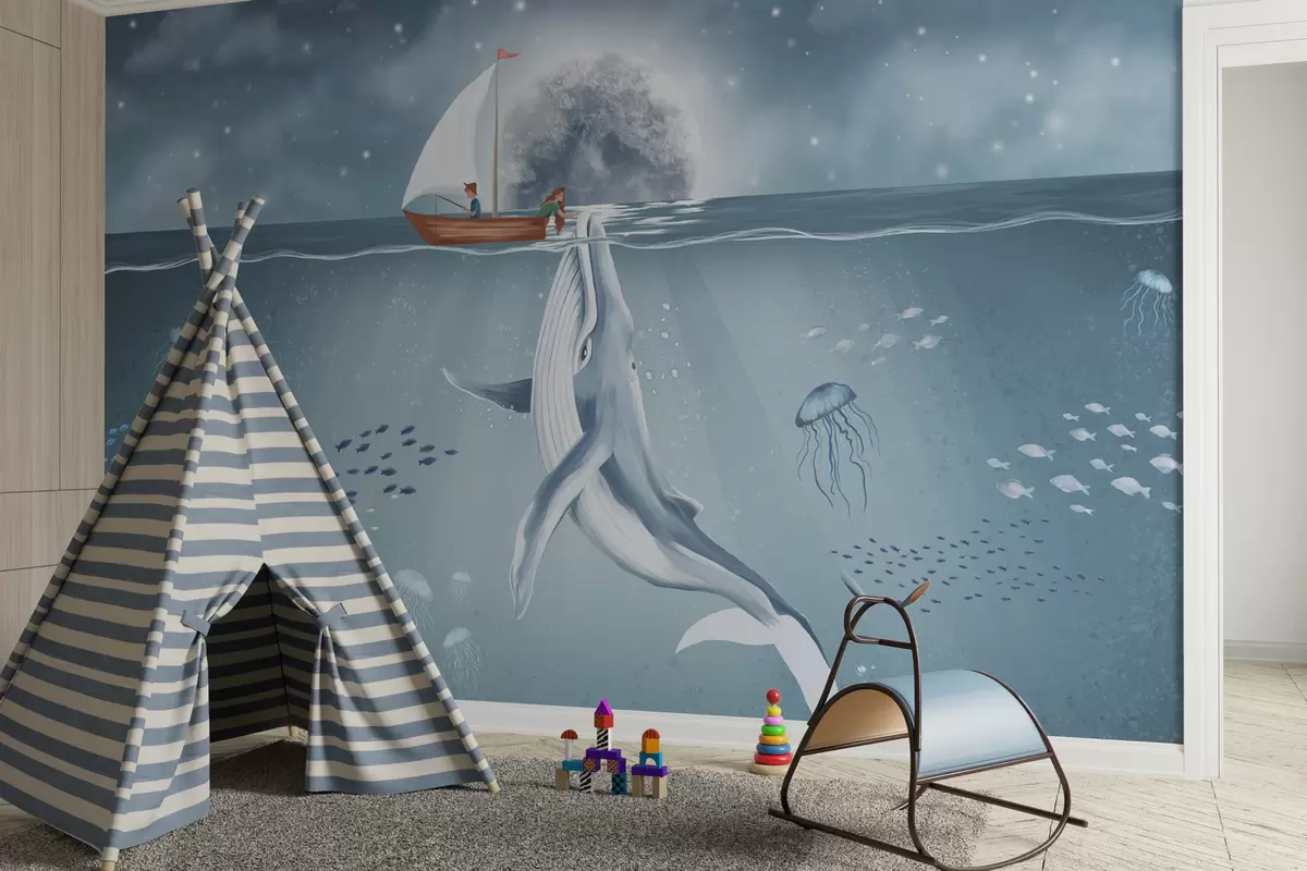 Children's design with whale, moon and boat with children - Wall mural (No. w02476)