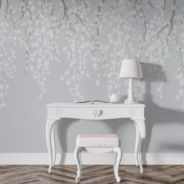 Falling delicate branches with flowers on a blue background - Wall mural (No. w02479)