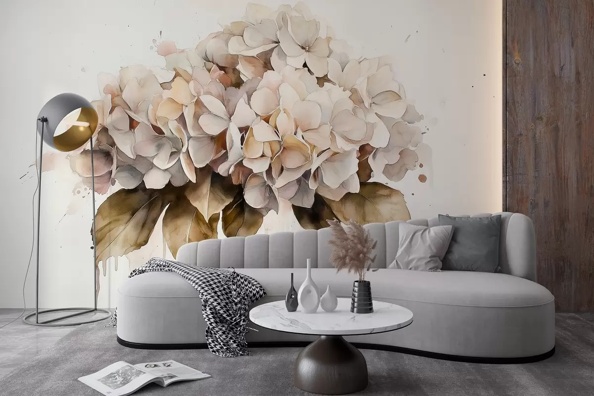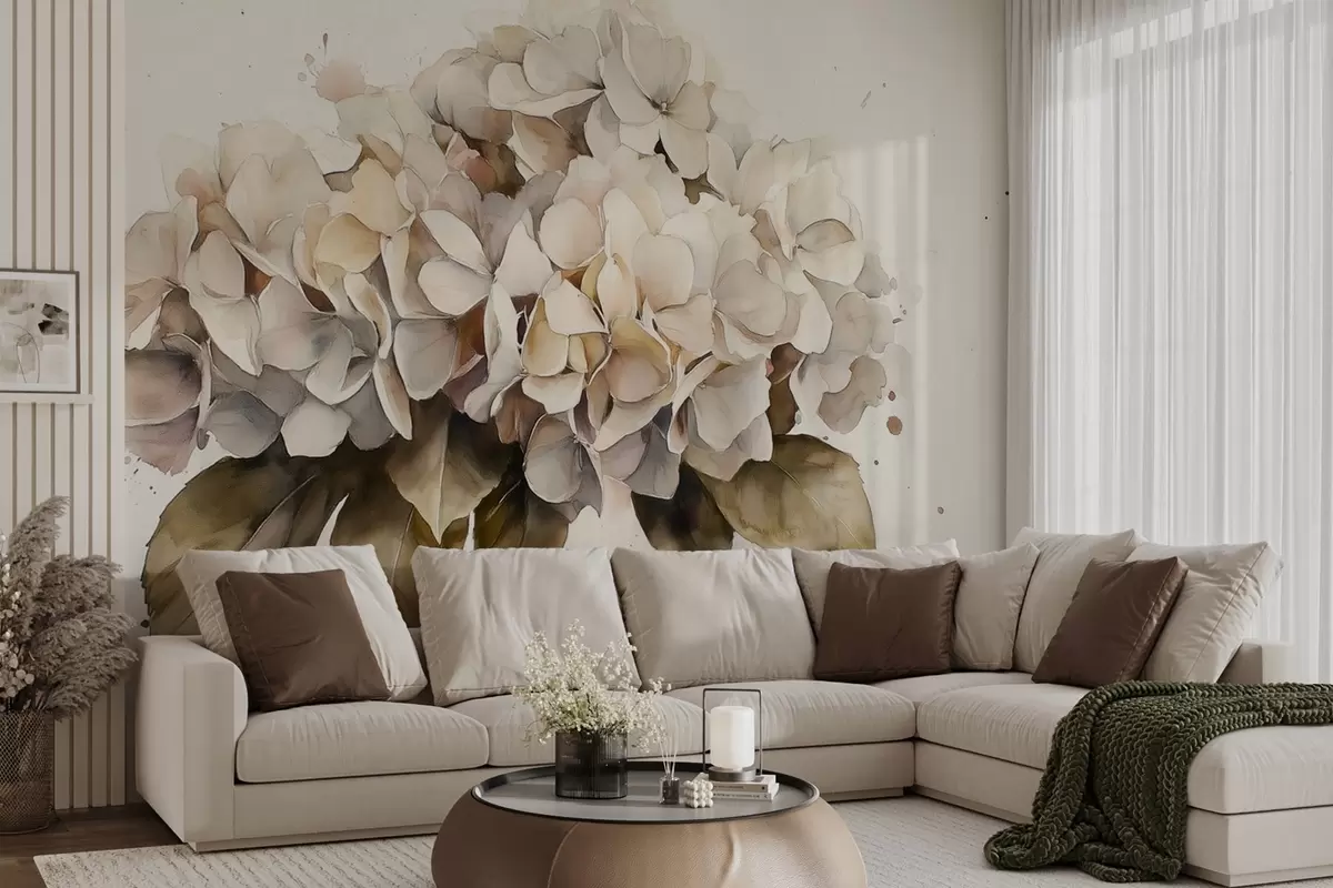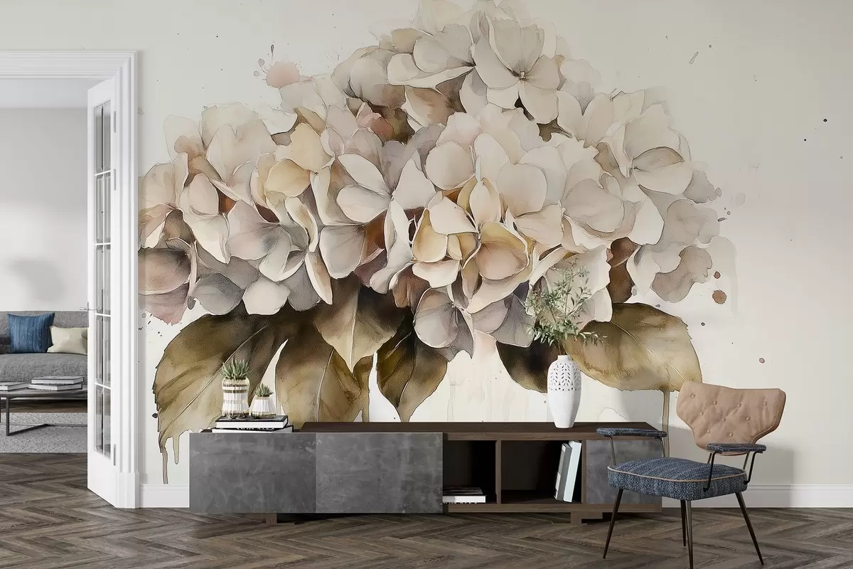 Watercolor style drawing of hydrangea flower, beige colors - Wall mural (No. w02485)